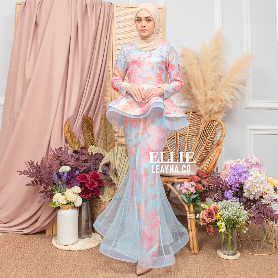 A fashionable baju kurung with delicate lace and beads embroidery.